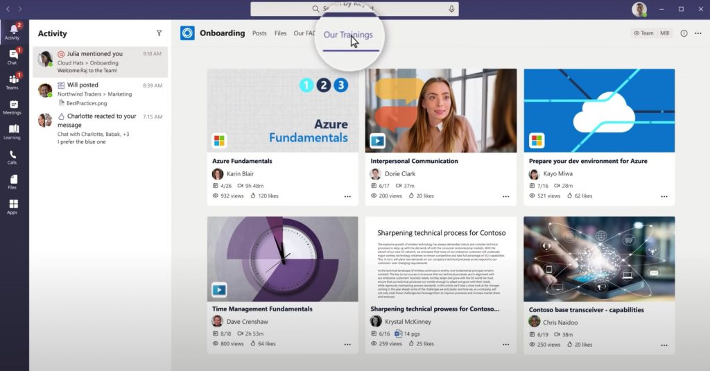 Teams ist damit nicht nur der zentrale Ort zur Zusammenarbeit, sondern inkludiert auch ein eigenes Learning System. Trainings können so direkt in Teams absolviert werden. GefĂ€llt Ihnen das Training besonders gut oder haben noch weiterfĂŒhrende Ideen? Dann starten Sie direkt eine Diskussion in Teams mit Ihren Kollegen ĂŒber das absolvierte Training oder weisen Sie das Training Ihren Mitarbeitern zu!