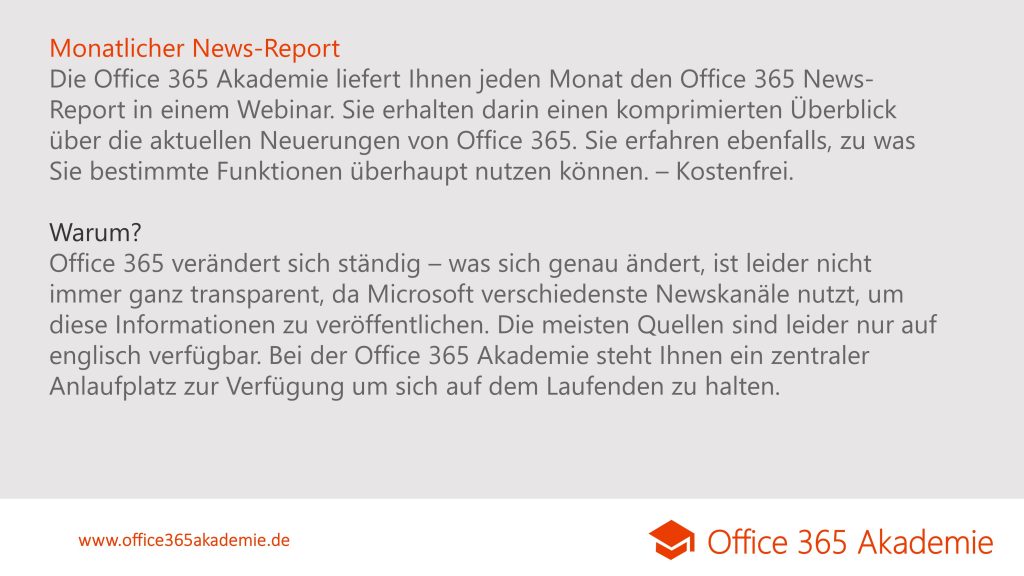 Die Office 365 Akademie liefert Ihnen jeden Monat den Office 365 News-Report in einem kurzen Video. Sie erhalten darin einen komprimierten Überblick über die aktuellen Neuerungen von Office 365. Sie erfahren ebenfalls, zu was Sie bestimmte Funktionen überhaupt nutzen können. – Kostenfrei.